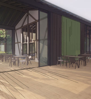 Das Marktkonzept nutzt Elemente aus der bestehenden Hofstruktur: Ein alter Futtertisch wird in einen zentralen Präsentationsbereich umgewandelt, wo frische Erzeugnisse in modularen Holzelementen ausgestellt werden. Für trockene Lebensmittel wie Getreide oder Hülsenfrüchte gibt es Nachfüllstationen, inspiriert von den Silos des Hofs. Sie sind über eine erhöhte Plattform begehbar und ermöglichen eine effiziente Befüllung von oben. Im angrenzenden Bistro werden hofeigene Produkte direkt verarbeitet – nicht nur für die Bewohner, sondern auch für Gäste und Besucher. Hier kann jede*r gegen einen kleinen Beitrag mitessen, während der offene Wohnbereich zum Austausch, Lernen oder einfach Entspannen einlädt.
